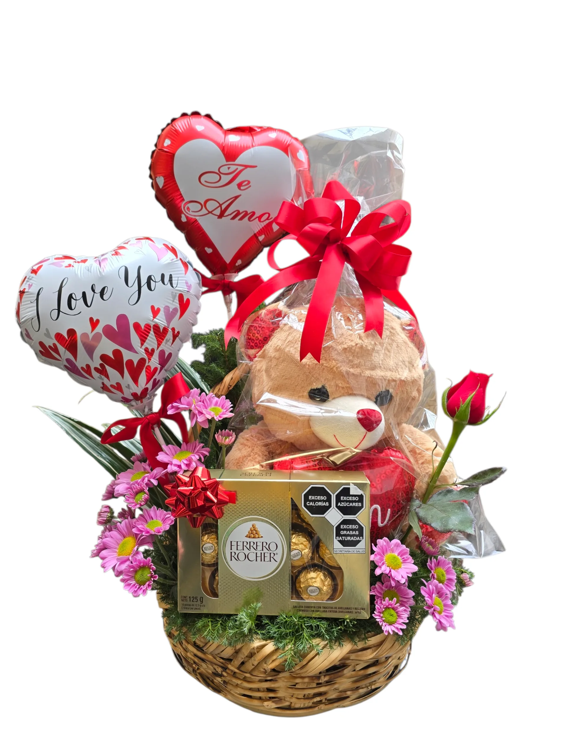 Arreglo floral, peluche oso love, chocolate ferrero, globo